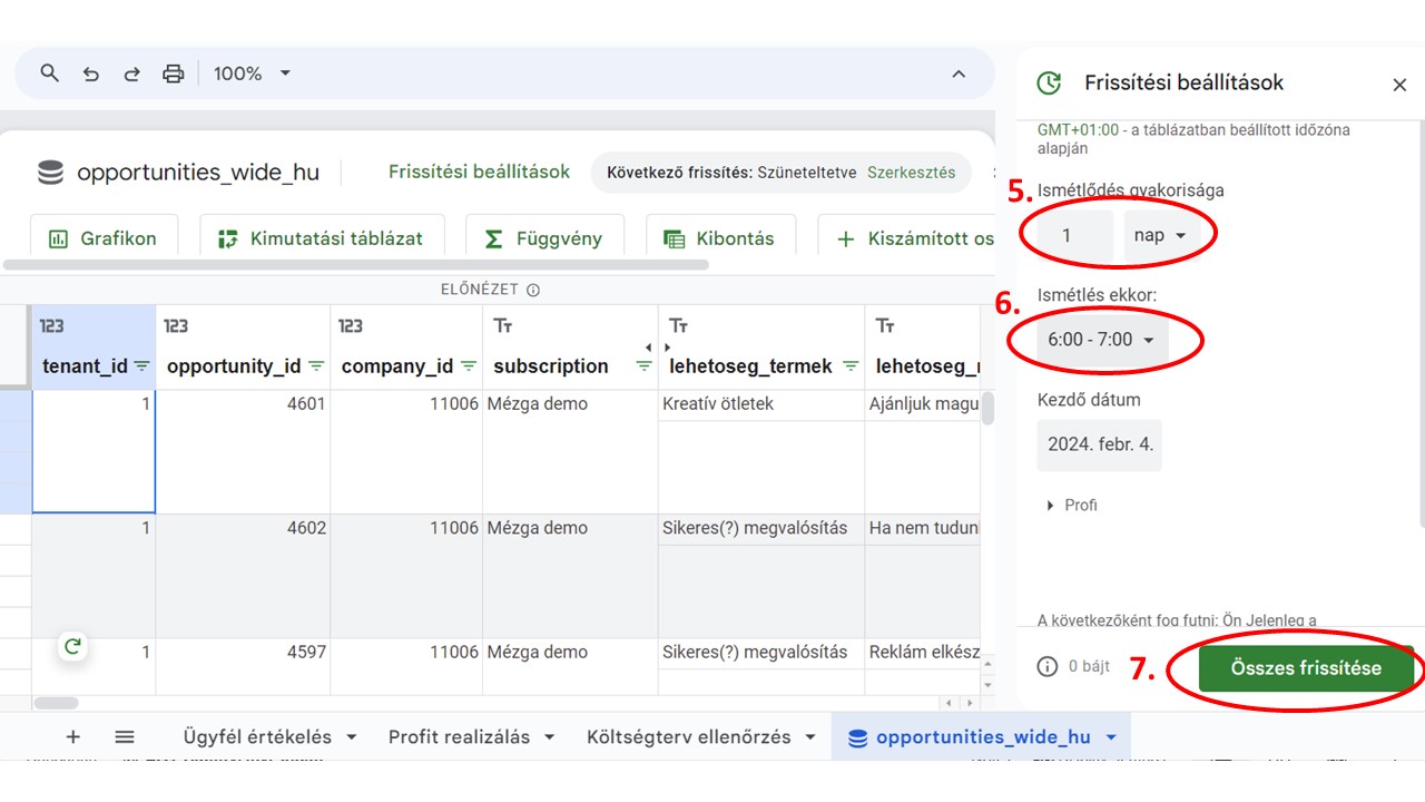 Szekció neve “Napi frissítés beállítása”Az általunk biztosított Gsheetben kattintson a következőkre:
