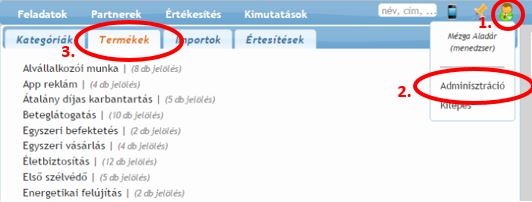 Menü: Fejlécben Zöld emberke/Adminisztráció/Termékek Video