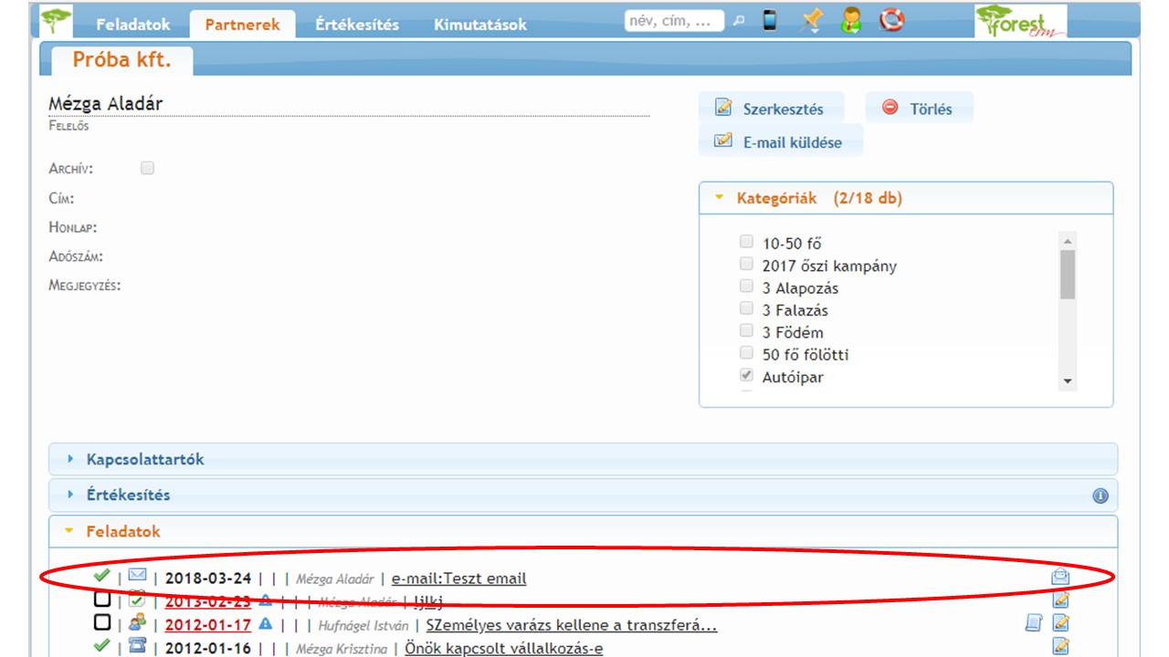 Szekció neve “Hogyan működik a Forestbe érkezett email-ek megjelenítése?”Az ügyfélnek elküldött email-ről titkos másolatot küldhetünk a ForestCRM-be. A rendszerben az email egy végrehajtott feladatként jelenik meg.