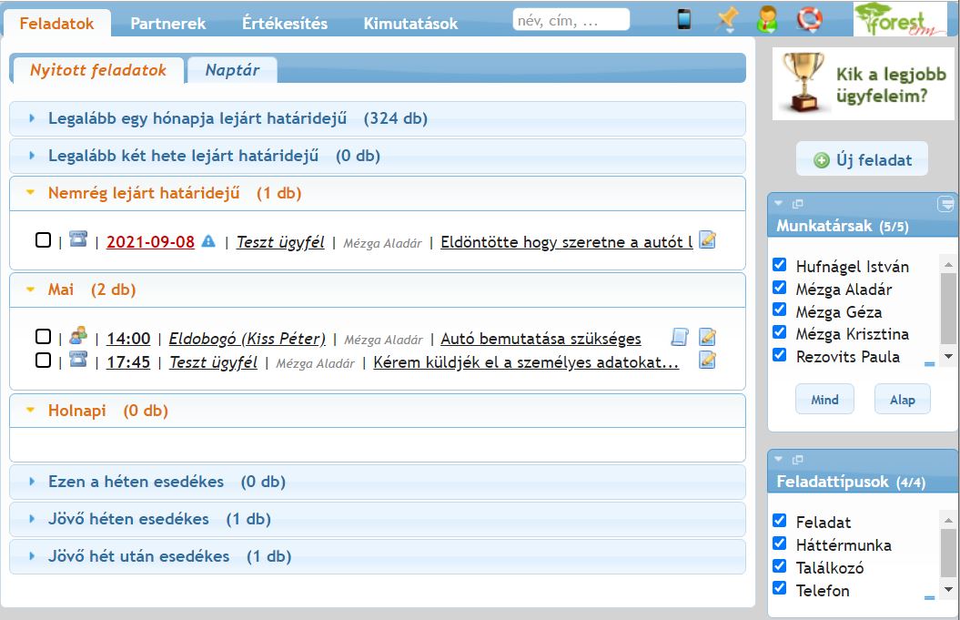 Szekció neve “Nézzünk egy példát!”Ha elindítjuk a ForestCRM Demo-t, akkor a kezdő képernyőn az összes elvégzendő felatadot látjuk.