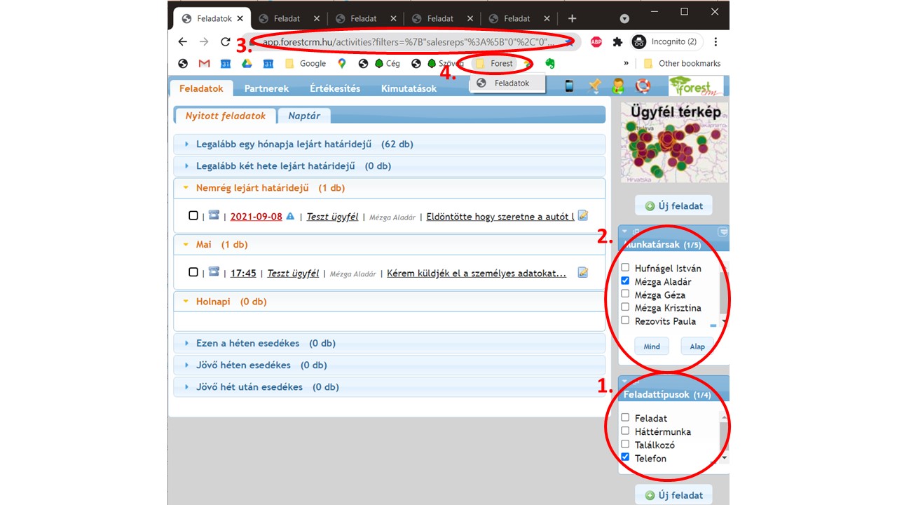 legközelebb a könyvjelző sávban elhelyezett (a szűrőket is tartalmazó) linkről kell elindítanom a ForestCRM-et. Ebben az esetben már csak a rám vonatkozó telefonhívások fognak megjelenni a nyitott feladatok között.