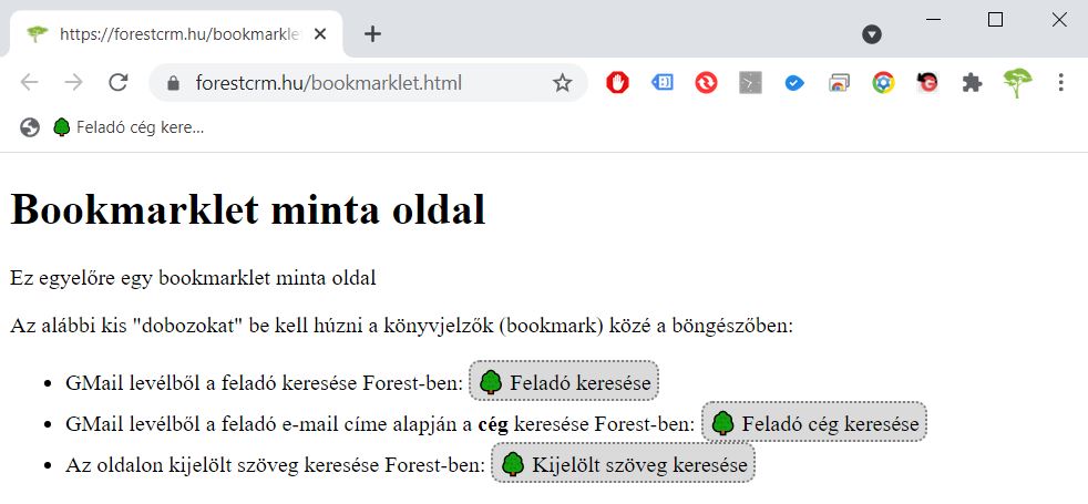 - Ezen az oldalon rá kell kattintani a “GMail levélből a feladó e-mail címe alapján a cég keresése Forest-ben” ikonra és fel kell húzni a könyvjelző sávba.
