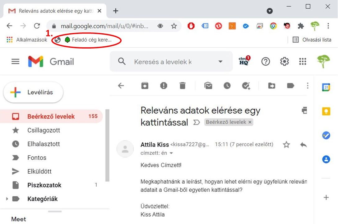 Ha egy kontaktként nyilvántartott ügyféltől levelet kapunk, a Gmail-ből egy kattintással elérhetjük a ForestCRM-ben tárolt adatait.
