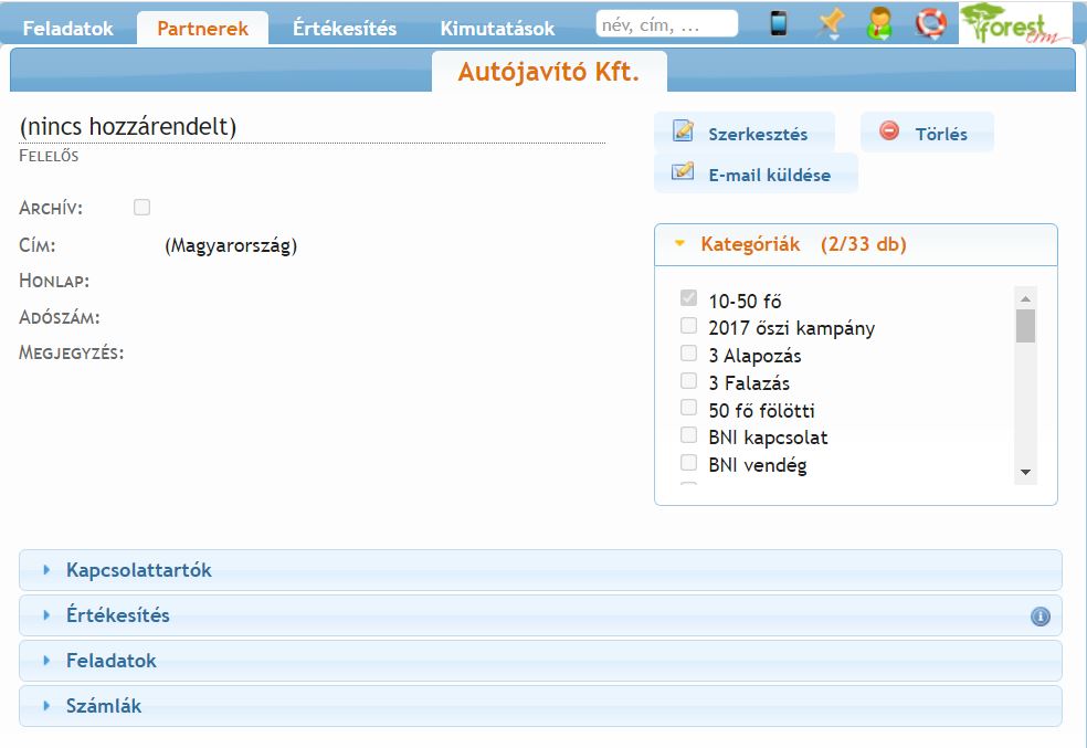 Ha a levél feladója csak egyszer szerepel a ForestCRM-ben, akkor automatikusan felugrik a releváns cég adatait összefoglaló ForestCRM ablak. Innét minden ügyféladat könnyen elérhető: