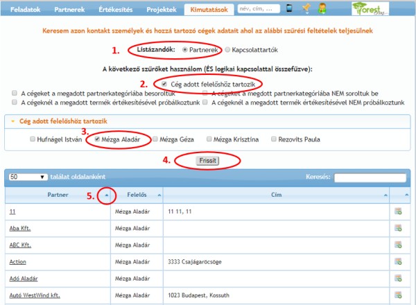 - Cég adott felelőshöz tartozik (ennek hatására kinyílik a “Cég adott felelőshöz tartozik” szűrő, ahol be lehet jelölni, hogy mely munkatárshoz rendelt partnereket szeretnénk listázni)