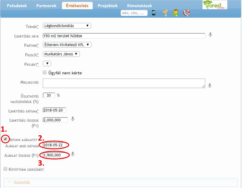 Szekció neve “Ajánlat fázis beállítása”Ha az üzleti lehetőségben elérjük az ajánlatadást, azt a ForestCRM-ben is érdemes jelezni. Az előző lépésben leírtakhoz hasonlóan keressük meg az érintett üzleti lehetőséget.