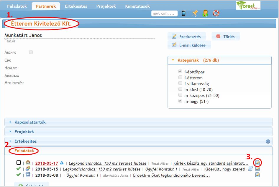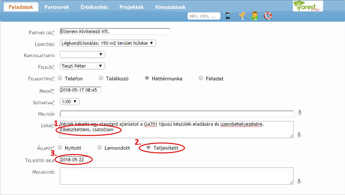Mintapéldánkban Teszt Péter elkészítette a számára delegált ajánlatkészítési feladatot. Péter a következő lépéseket végzi el a ForestCRM-ben: