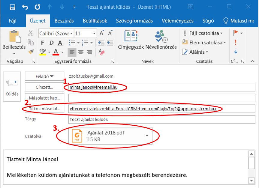 A “Titkos” másolat címbe bekerül egy email cím, ami alapján a ForestCRM-ben is megtalálható lesz az email