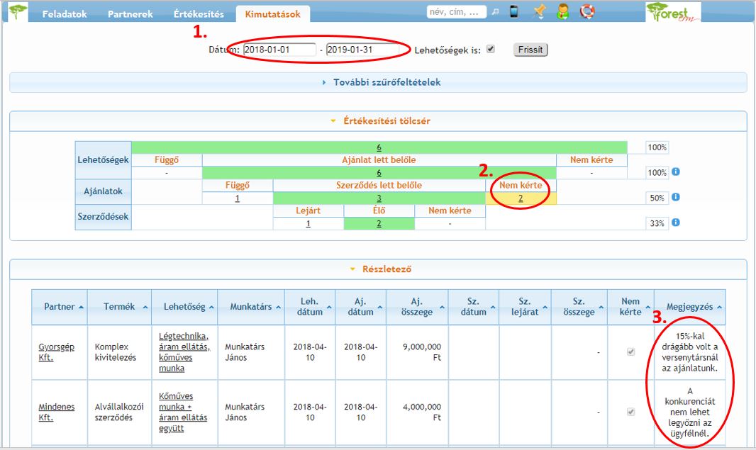 Az értékesítési tölcsér “Nem kérte” számaira kattintva