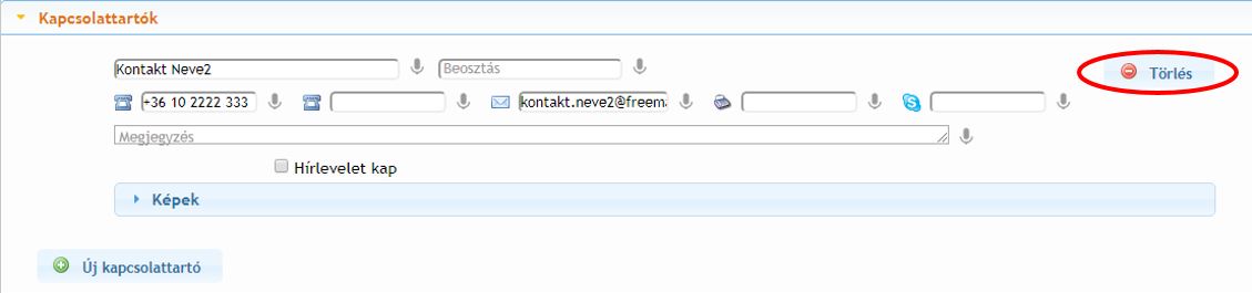 A felugró ablakban a törlendő kontakt sorában lévő “Törlés” gombbal tudjuk kitörölni az adatbázisból a személy adatait.