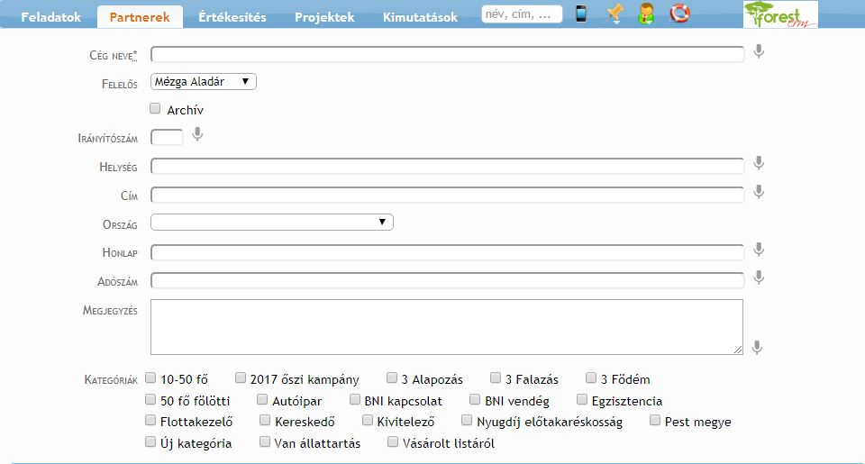 Szekció neve “Milyen adatok rögzíthetők?”A ForestCRM fejlesztése során egyik fontos szempontunk az egyszerűség fenntartása. Emiatt a partnerről rögzítendő adatok mennyiségét is igyekszünk minimális szinten tartani amellett, hogy helyet biztosítunk tetszőleges adatok rögzítésére is (lásd Megjegyzés mező).