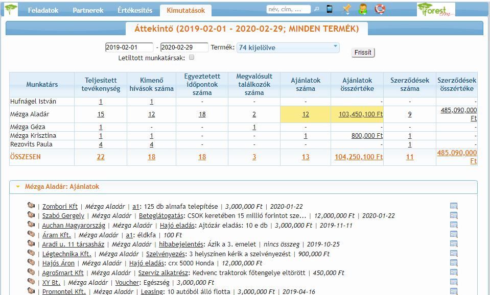 - mennyi ajánlatot bocsátott ki (mennyi üzleti lehetőség “Ajánlat adás dátuma” esik a vizsgált időszakba),