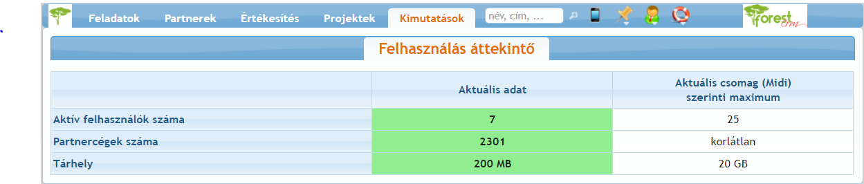 Szekció neve “Riport tartalma”A riportban az előfizetés szerinti ForestCRM csomag által biztosított erőforrások és a ténylegesen felhasznált erőforrások kerülnek kilistázásra.
