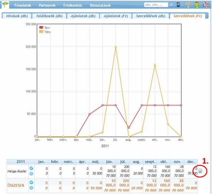 - Havi összehasonlí- tás: sárgával a tény adatokat, pirossal a terv adatokat jelenítjük meg havonta. Így láthatóvá válik, hogy a munkatárs melyik hónapban teljesítette vagy nem teljesítette az előírt tervet.