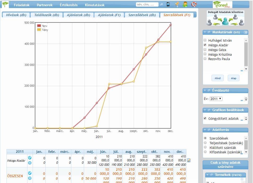 Szekció neve “Hogyan állapíthatjuk meg, hogy a terv felett vagy alatt teljesített a munkatárs?”A terv összehasonlítást a ForestCRM renszer automatikusan végzi. A munkatárs által naponta rögzízett adatok alapján összegezzük a fent részletezett értékeket és kétféleképpen megjelenítjük a kimutatáson: