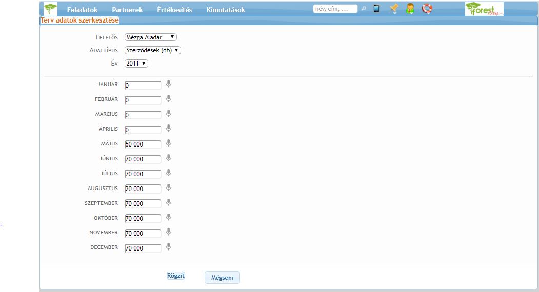 A terv adatok szerkesztése képernyőn ki kell választani a munkatárs, a rögzítendő terv típust valamint az érintett évet, majd után a havonta meg kell adni az elérendő mennyiségeket. A “Rögzít” gomb megnyomásával a rendszer elmenti a tervet.