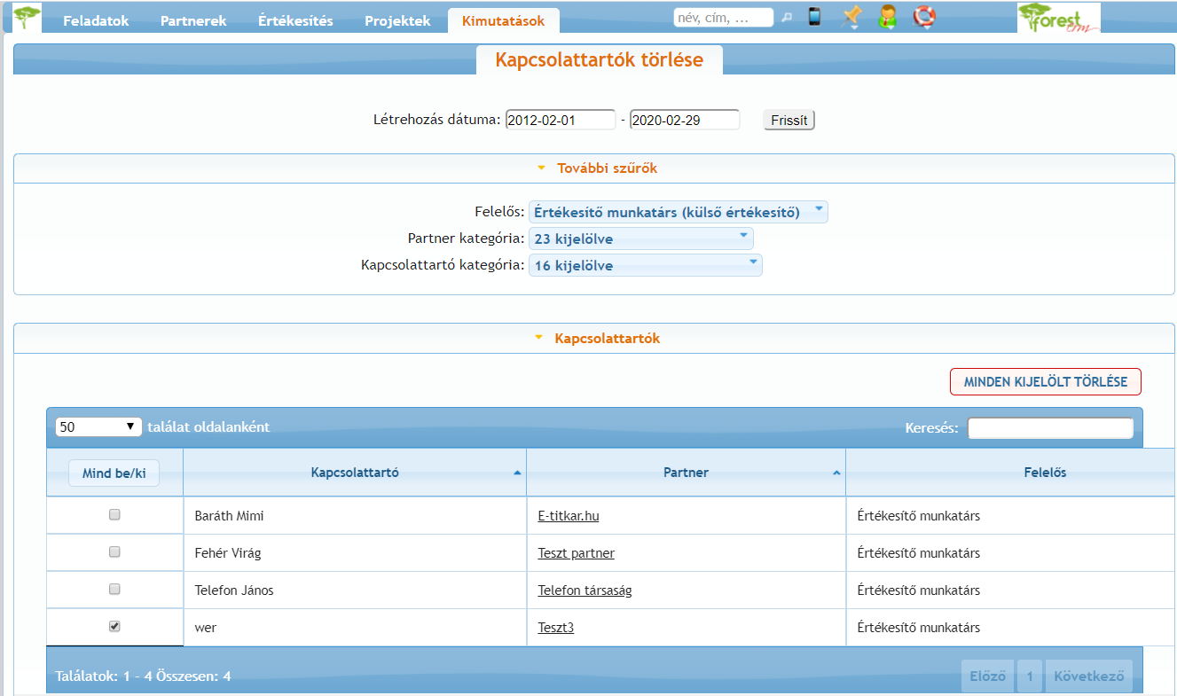 A Frissítés gomb megnyomását követően a szűrőfeltételeknek megfelelő kapcsolattartók megjelennek a listában. A nevek előtt lévő pipával kijelölhetjük azokat, akiket ki szeretnénk törölni az adatbázisból. A MINDEN KIJELÖLT TÖRLÉSE gomb megnyomása után a rendszer rákérdez, hogy biztosan törölni szeretnénk-e a kapcsolattartókat. Vigyázat, ennek elfogadása után NEM LEHET VISSZAÁLLÍTANI a kapcsolattartók adatait!!!