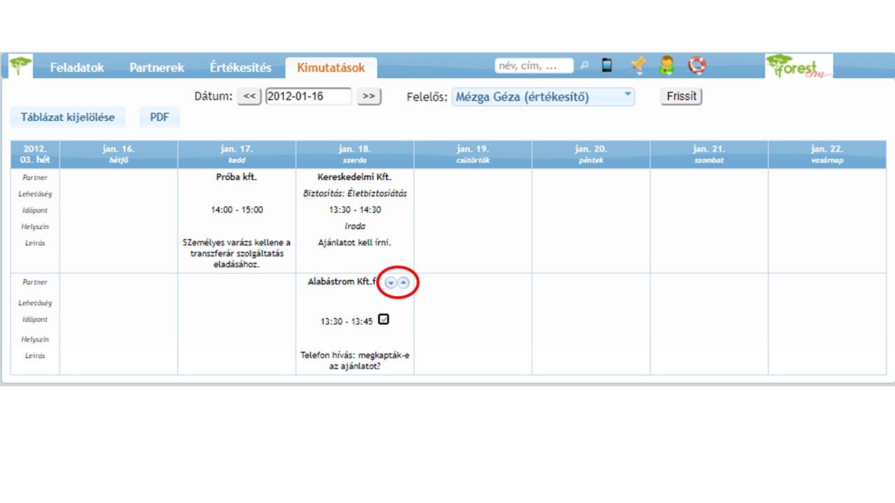Szekció neve “Riport tartalma”Azoknak a munkatársaknak, akik valamilyen okból nem használnak számítógépet (például munkagép mellett dolgoznak), készíthetünk heti munkatervet papíron is. A Nyomtatható naptáron megjeleníthetők egy munkatárs feladatai. Ha egy időpontban több feladat is megjelenik, akkor az egérrel az adott cég mellett megjelenő le-fel nyíllal a feladatok sorrendjén is lehet változtani.