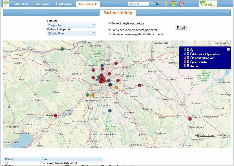 Szekció neve “Kimutatás célja”Különböző fázisban lévő partnerek megjelenítése térképen annak érdekében, hogy segítsük az üzleti látogatások tervezését.