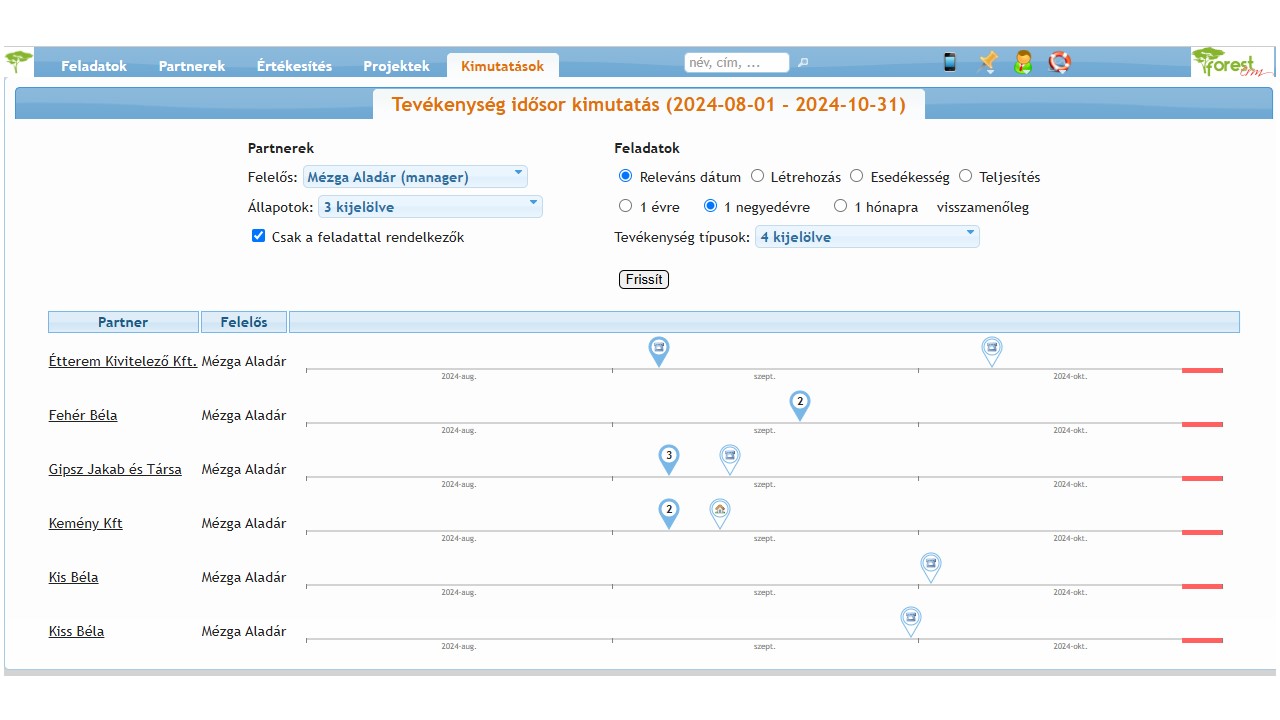 Ha csak egy-egy partnerrel kapcsolatos feladatokat vizsgáljuk, ott negyedévre visszatekintő skálán láthatjuk a feladatokat.