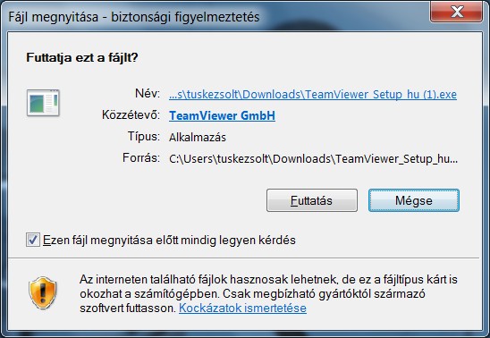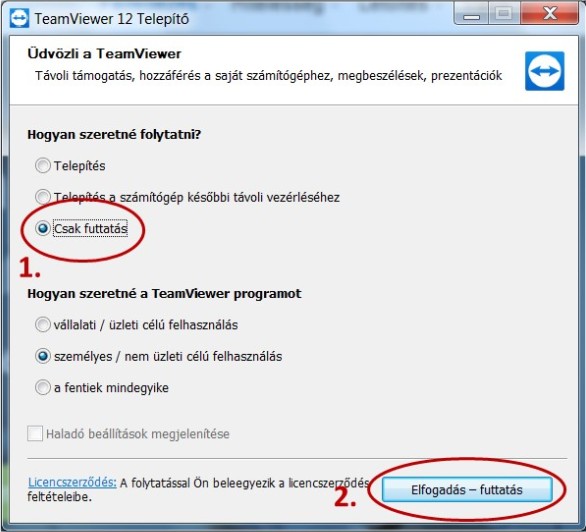 - Ha csak egyszer szeretné a Teamviewer-t futtatni, akkor a “Csak futtatás” opciót válassza